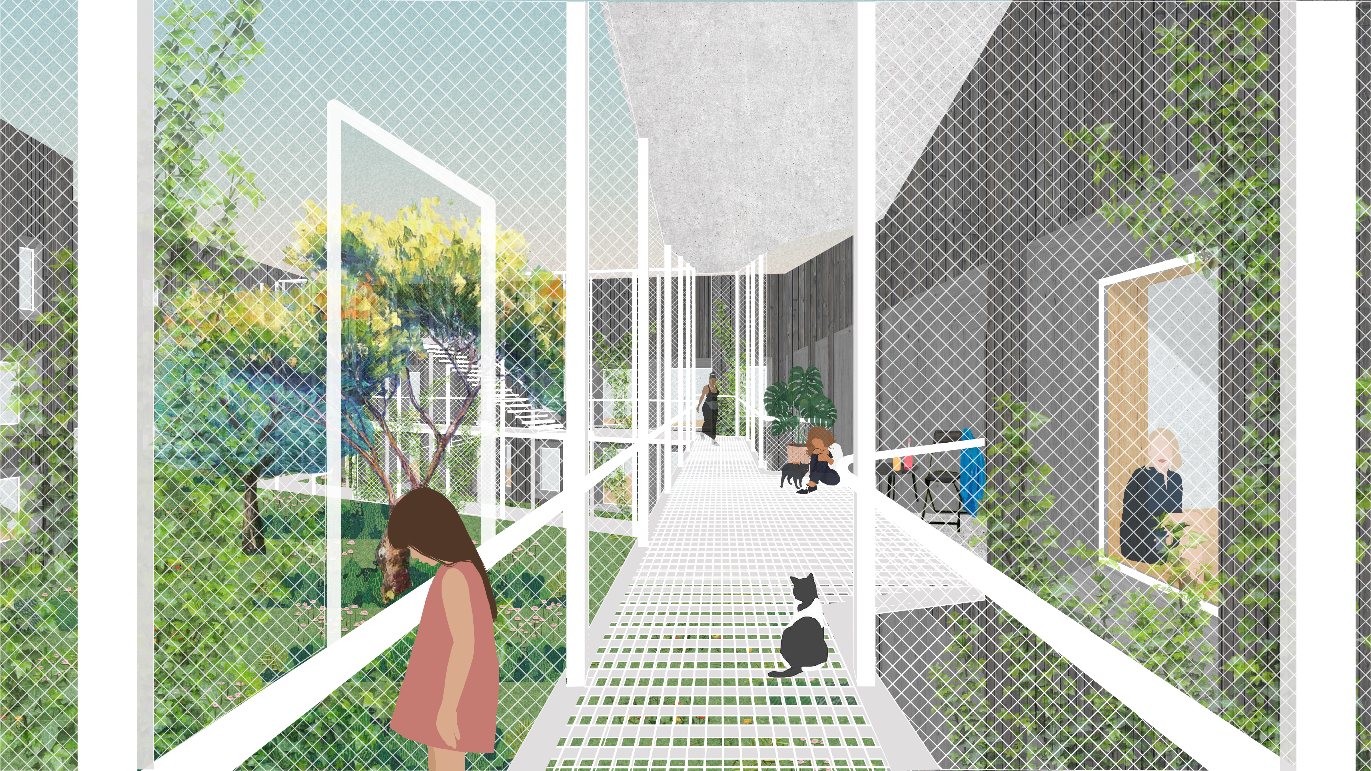 This project’s main priorities were environmental systems and strategies to address urban heat island effect and tree cover scarcity in relation to redlining. Environmental considerations are addressed in the landscape through tree planting and the reduction of impervious surfaces. The two buildings are also designed through an environmental lens by considering solar gain and orientation, daylighting in units, CLT structure, ample insulation, and an exterior circulation system that allows plants to grow vertically.